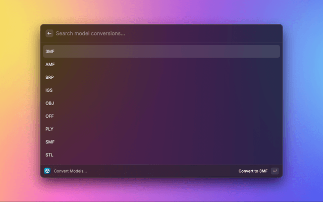 • Quick conversions to popular formats: Quickly convert your models to popular formats with direct conversion commands.