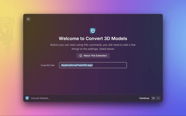 This extension relies on having FreeCAD installed on the machine. You will be prompted to specify the path that FreeCAD is installed.