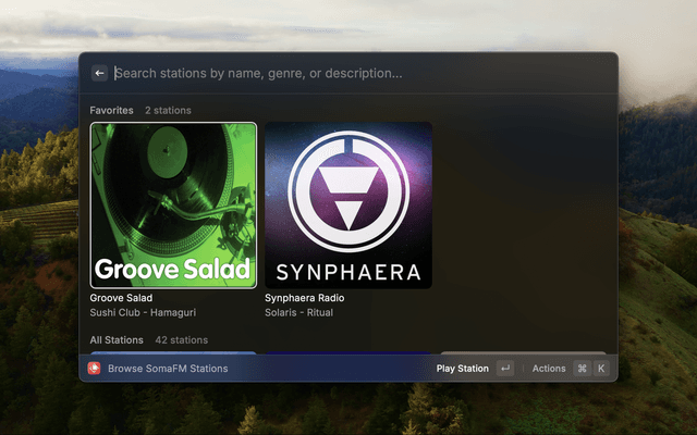 Note: "SomaFM" is the correct branding for this service. The Raycast linter may suggest "Somafm" but we're keeping the official branding.
