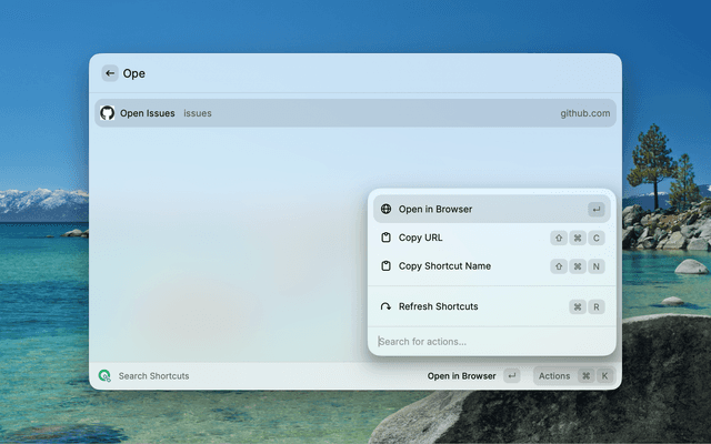 Browse and search all your shortcuts with Raycast's fuzzy filtering. Results are cached locally for 5 minutes so repeated searches are instant.