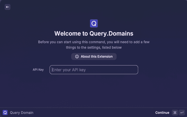 Your API key is stored securely in Raycast's preferences and is only used to authenticate with the query.domains API. No other data is collected or transmitted.