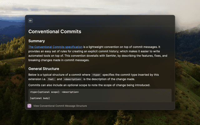 - Start typing the full or partial command name (View Conventional Commit Message Structure)