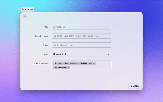Using this Raycast extension you can view the monitoring results of all your sites and add new sites to monitor to Oh Dear.