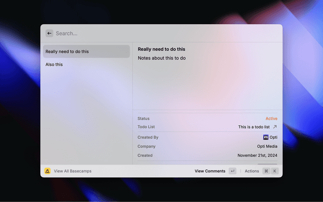 Manage your projects and todos from Basecamp directly in Raycast. This extension helps you stay on top of your tasks, collaborate with your team, and boost your productivity without leaving your keyboard.