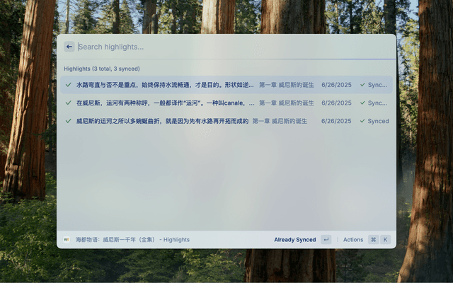 • Incremental Sync (⌘I): Sync only new highlights since last sync