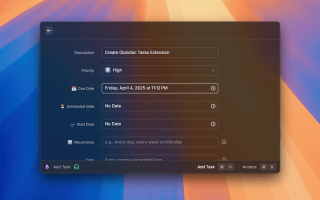 A Raycast extension to manage your Obsidian tasks from your menubar, with full support for the Obsidian Tasks Plugin format. This extension is specifically designed to work with the official Obsidian Tasks Plugin, maintaining complete compatibility with its task format and features, but it can be used without it too.