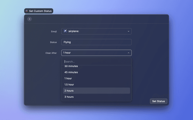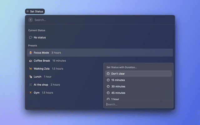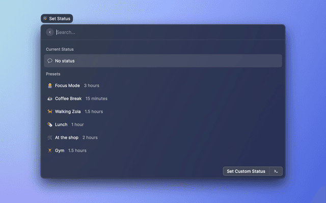 Extension for quickly changing your Slack status. Set up presets for common statuses or set a custom one. Make sure to explore available actions in the action panel (⌘ + K). And if you want to spice it up, use Raycast AI to set your status. Simply type what you are doing and hit return to let AI pick an emoji, title, and duration of your status.