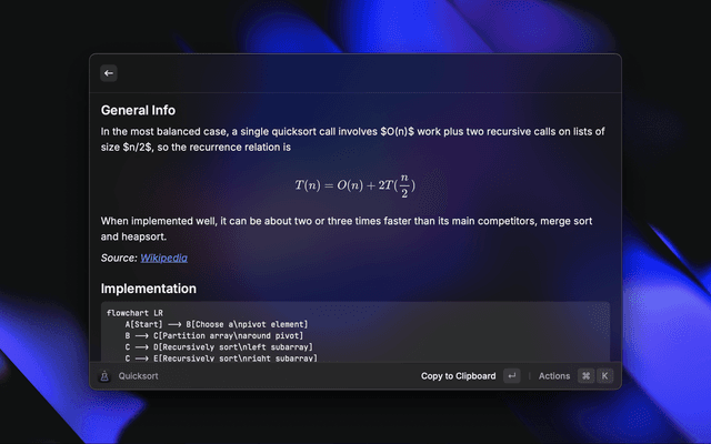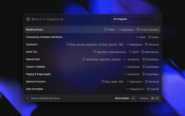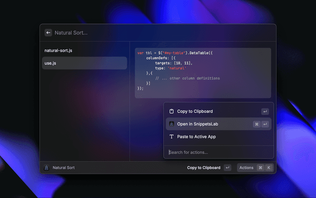• Perform actions such as Copy to Clipboard, Paste to Active App, and Open in SnippetsLab.