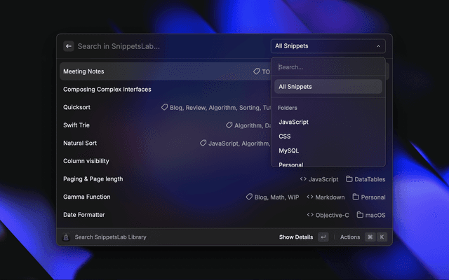 • Search for any snippet in your SnippetsLab library directly from Raycast.