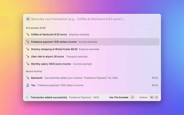 Easily add and manage financial transactions in your Rewiser account — directly from Raycast.
