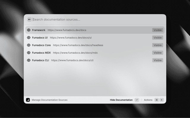 - Manage Documentation Sources: Add, remove, or toggle visibility of documentation sources