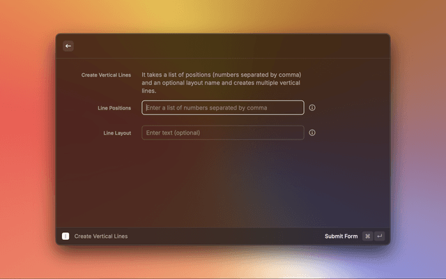 NUMBER,NUMBER,NUMBER]&layout=STRING?It takes a list of horizontal positions (number) and vertical positions (number) and an optional layout name and creates a multiple vertical lines.