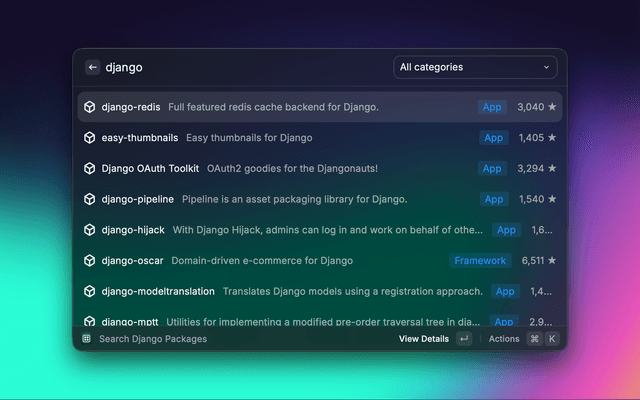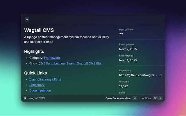 Explore djangopackages.org without leaving Raycast. Search packages, inspect metadata, and jump to docs, repos, or PyPI with a keystroke.