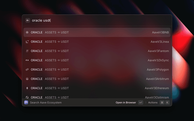 A Raycast extension that provides quick access to official Aave ecosystem smart contract addresses across multiple networks.