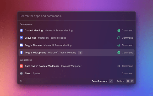 With this Raycast extension you can control a Microsoft Teams Meeting using your keyboard – no matter whether Microsoft Teams is currently the focused app or not. You can also define global hotkeys to toggle microphone and camera.
