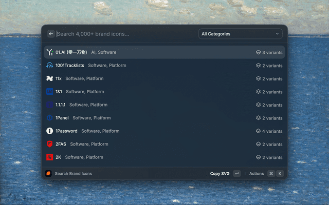Search, preview, and copy 4,000+ brand SVG icons from thesvg.org directly in Raycast.