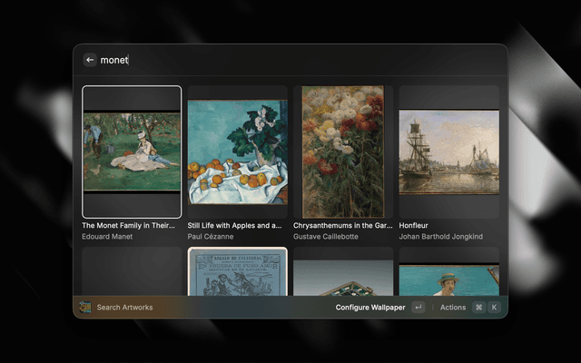 The extension fetches artwork images from the Met Museum's public API, converts them to ASCII characters using brightness mapping, and renders the result as a full-screen wallpaper image using macOS native text rendering (via sips and a compiled Swift renderer).