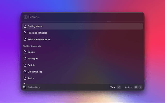 Simply open Raycast and search for "DevEnv Docs" to start browsing the documentation. Use the search bar to filter through available documentation pages and options.