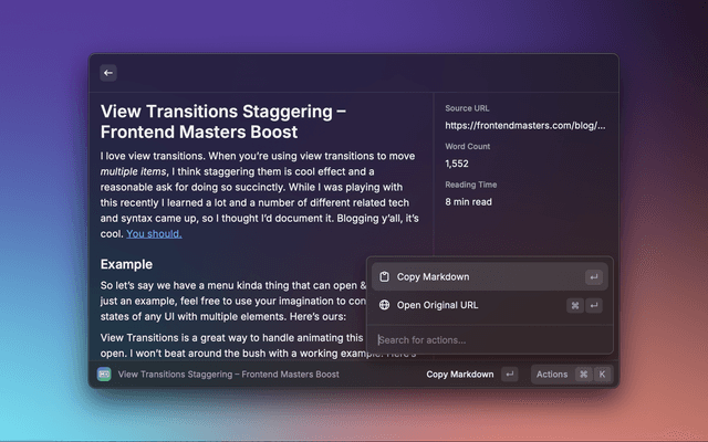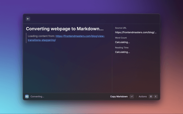 Transform any webpage into clean markdown. View directly in Raycast or copy to clipboard. Perfect for developers, note-takers and content-creators who need to save web content in markdown format.