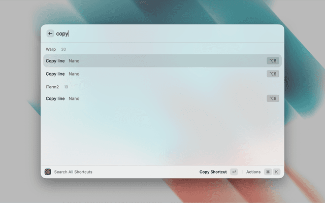 • Multi-step shortcut support (e.g. ⌘K → ⌘C)