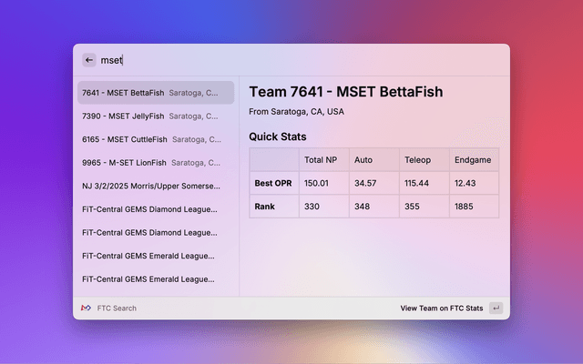 • FTC Search: Allows you to search for FTC teams and events, showing you either quick stats about a team or all the matches in an event.