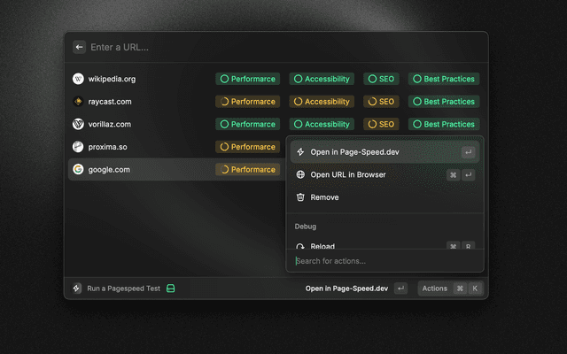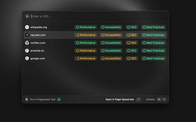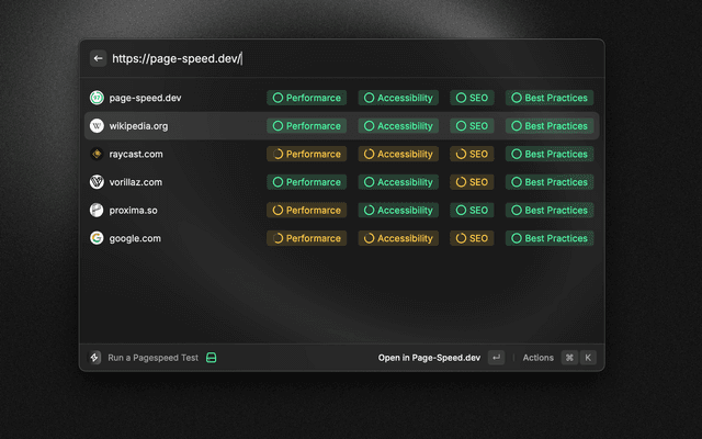 A simple Raycast extension to check the performance of a website using page speed insights from page-speed.dev.