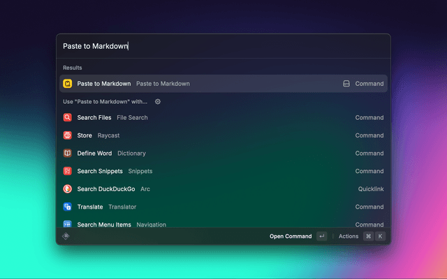 - Run the "Paste to Markdown" command in Raycast (or use the