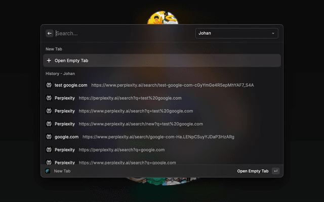 New Tab - Open new tab or search with PerplexitySearch Tabs - Find and switch between open tabsSearch History - Browse and open from browser historySearch Bookmarks - Access saved bookmarks quicklySearch All - Unified search across tabs, history, and bookmarksCreate New Window - Create new browser windowCreate New Incognito Window - Open private browsing session