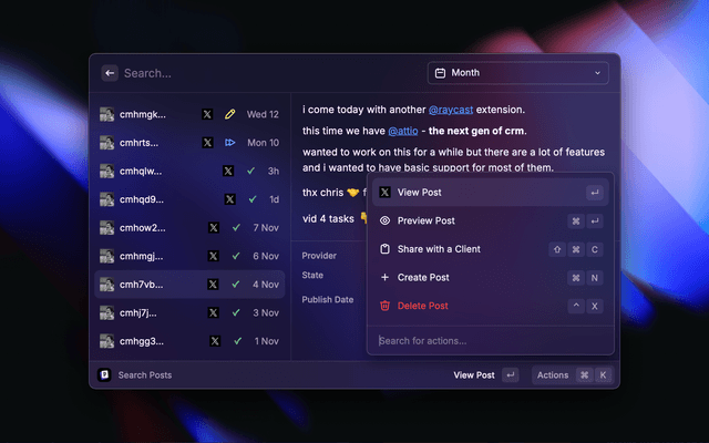This is a Raycast extension for Postiz - The All-in-One Social Media Management Tool. With this extension you can: