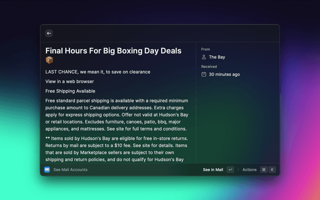 Extension for Apple Mail that allows you to check your email accounts and compose new messages using Raycast.